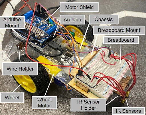 The goal of this project was to create a line following robot. The robot used Arduino programming, laser-cut pieces to hold components, and IR sensors to keep the robot on track. In this project I refined my laser-cutting skills and team communication skills. A challenge that we faced was organization of electrical components, so I designed wire containers for the power supply wires and Arduino data wire. We also learned how to use WiFi to communicate with the Arduino, and could send commands without the data cable.
